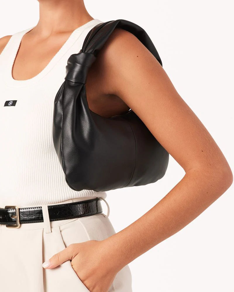 Give your look a little upgrade with the Myla Handle Bag. This mini, softly rounded clutch features a top zip with gold hardware, a semi-structured shape, and a cute knot detail on the handle. Simple, stylish, and easy to pair with anything.