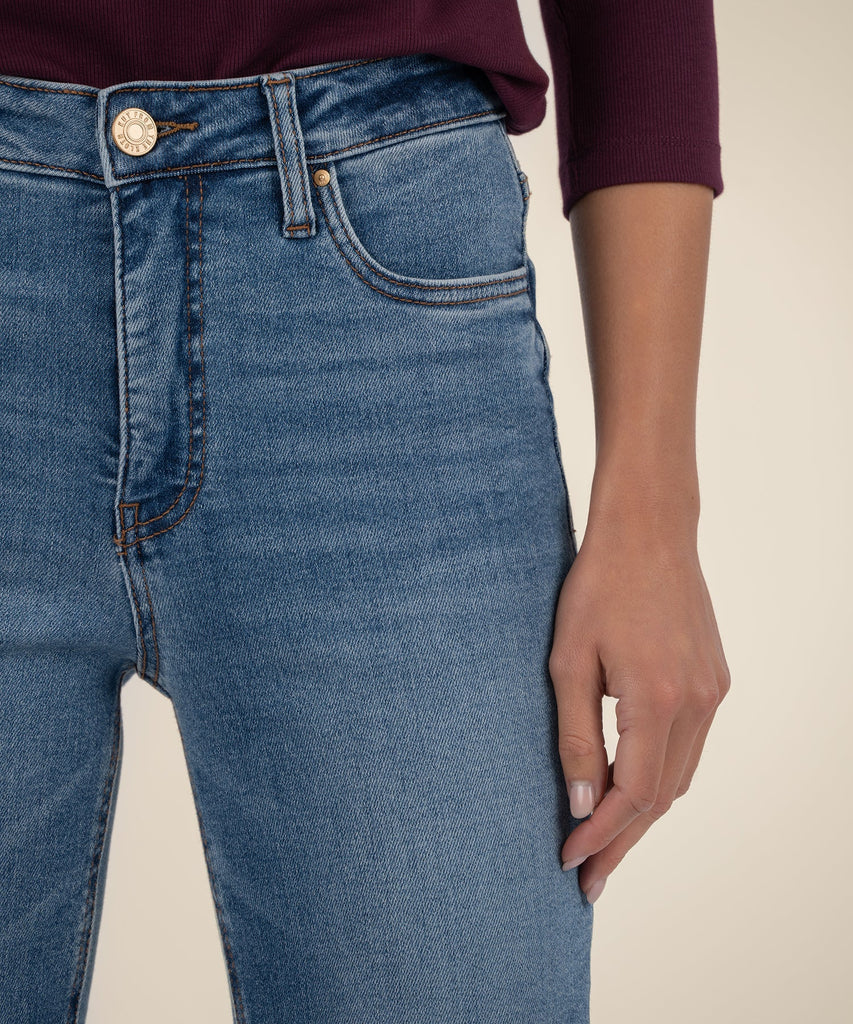 These high-rise jeans offer a clean, modern take on a classic silhouette. Designed in a medium wash with Fab Ab pockets for a flattering fit, they feature a raw hem and are made from stretchy material for all-day comfort and style.