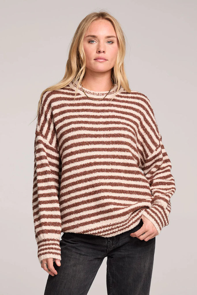 The Autumn Sweater channels vintage 70s charm with classic chocolate and cream stripes. Featuring a petite faux turtleneck, roomy cuffed sleeves, and a generous body, this pullover offers a sophisticated blend of comfort and timeless style.