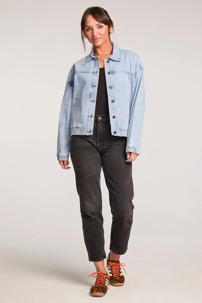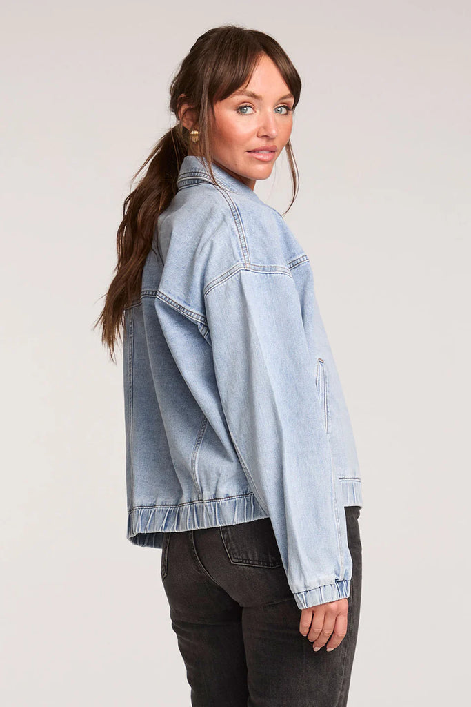 The Lenna Jacket is a classic jean jacket crafted from light denim fabric, featuring a cropped, boxy fit.
