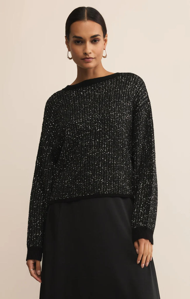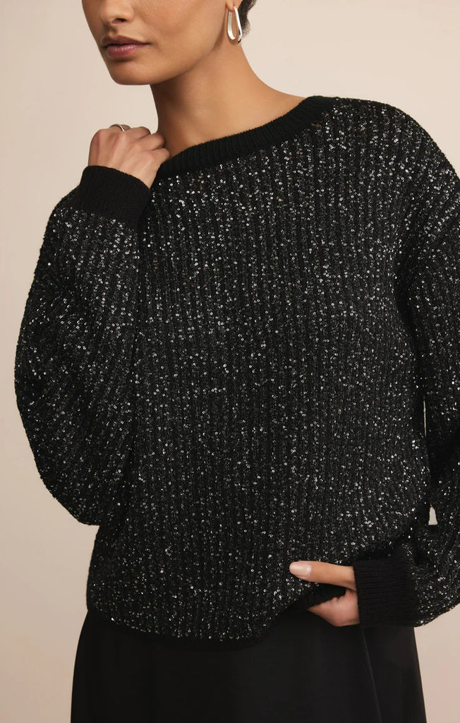 Designed to shine, this lightweight crewneck sweater is knit with shimmer yarns for a subtle sparkle. A relaxed fit keeps it wearable, making it perfect for holiday nights or casual glam moments.