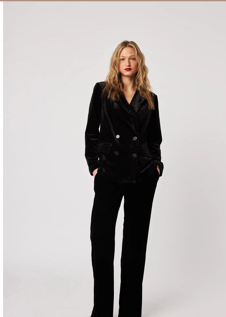 A chic velvet blazer with a classic double-breasted closure. Featuring a tailored fit and soft, luxe texture, it’s the perfect statement piece for day or night.
